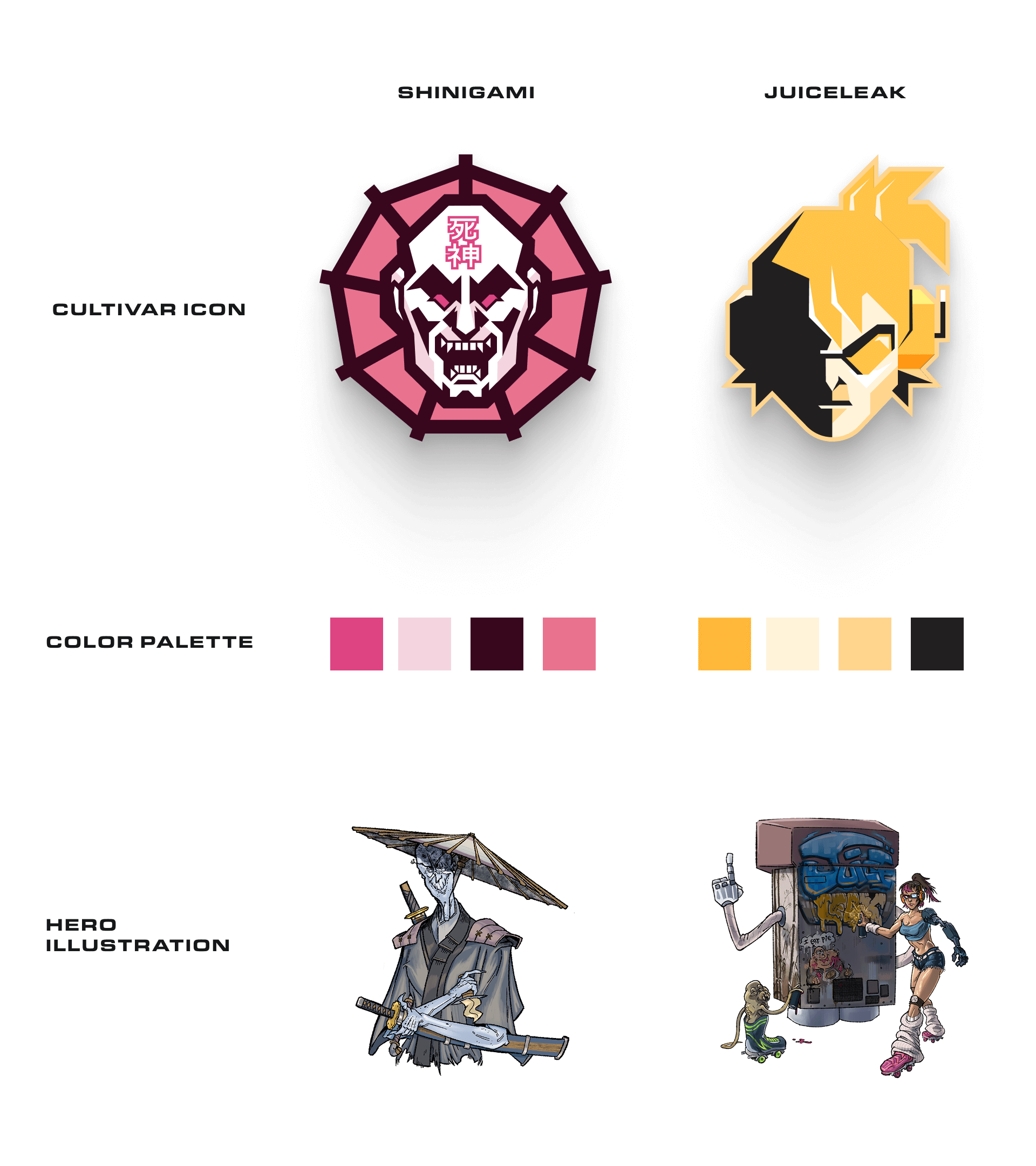For each cultivar, we decided there would be a “hero” style illustration and a more “graphic” symbol/icon for them. This opened the doors to more unique apparel designs, as well as treatments for compliant in-store and social promos.