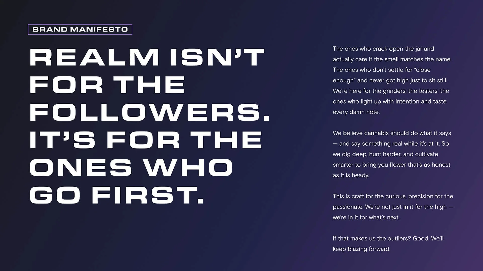 At the core of the brand, Realm Cannabis was about opening minds and perspectives. From our first Brand Discovery workshops, the stakeholders on the Realm Cannabis team made it clear that they aim to bring novices and the experts together through cannabis experiences enjoyed by anyone. No inside-baseball, just unparalleled flavor for the right set and setting. It’s ultimately where the whole “Realm” metaphor came from, and how they wanted to compel consumers to explore new ones. It was on us to help the team bring these two audiences together in a way that would excite and immerse them in our mission.
